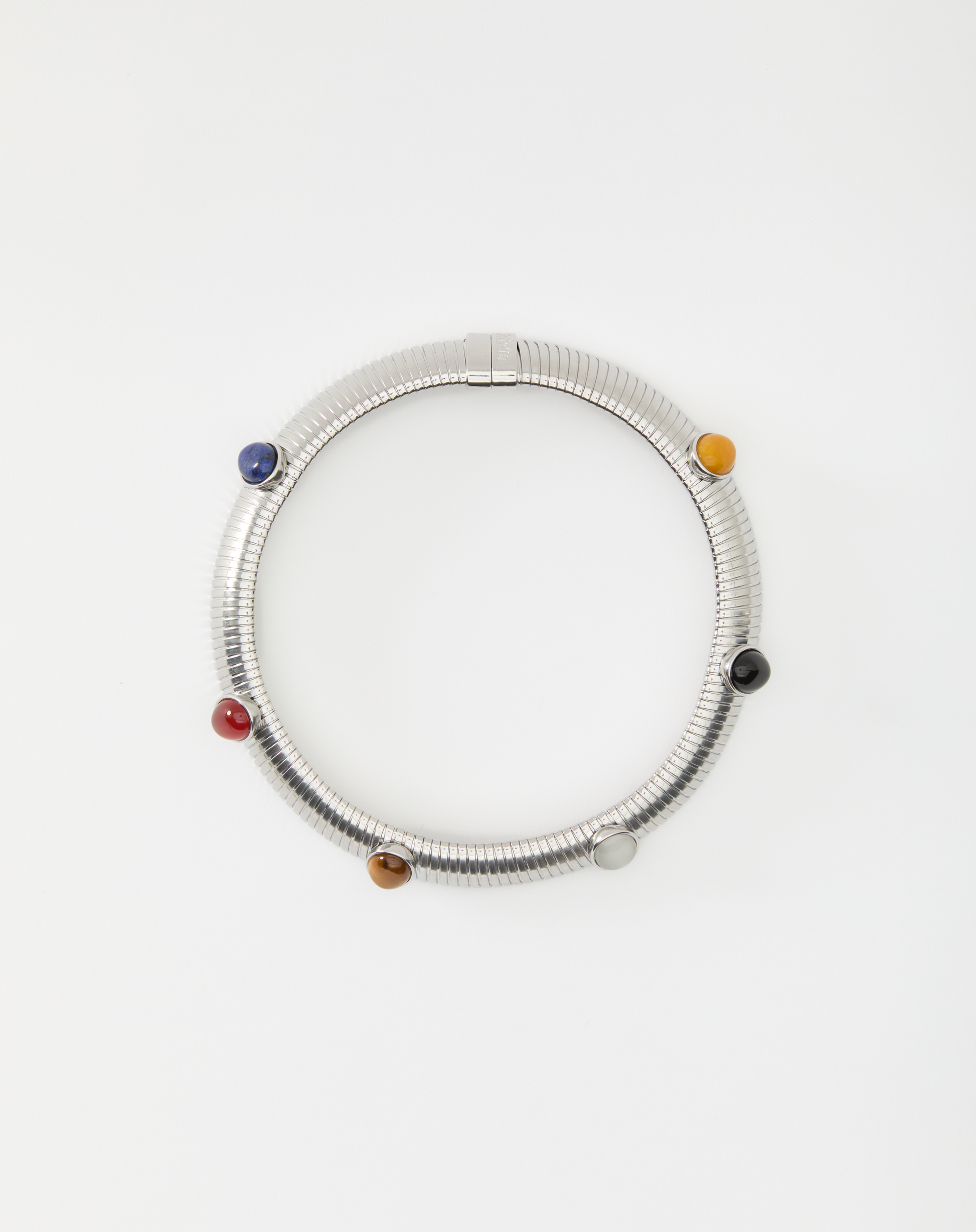 Meet Celeste. Exclusive to our website, this necklace is crafted with a flexible tubogas chain and set with five cabochon stones — lapis lazuli, tiger’s eye, moonstone, agate, and onyx.
