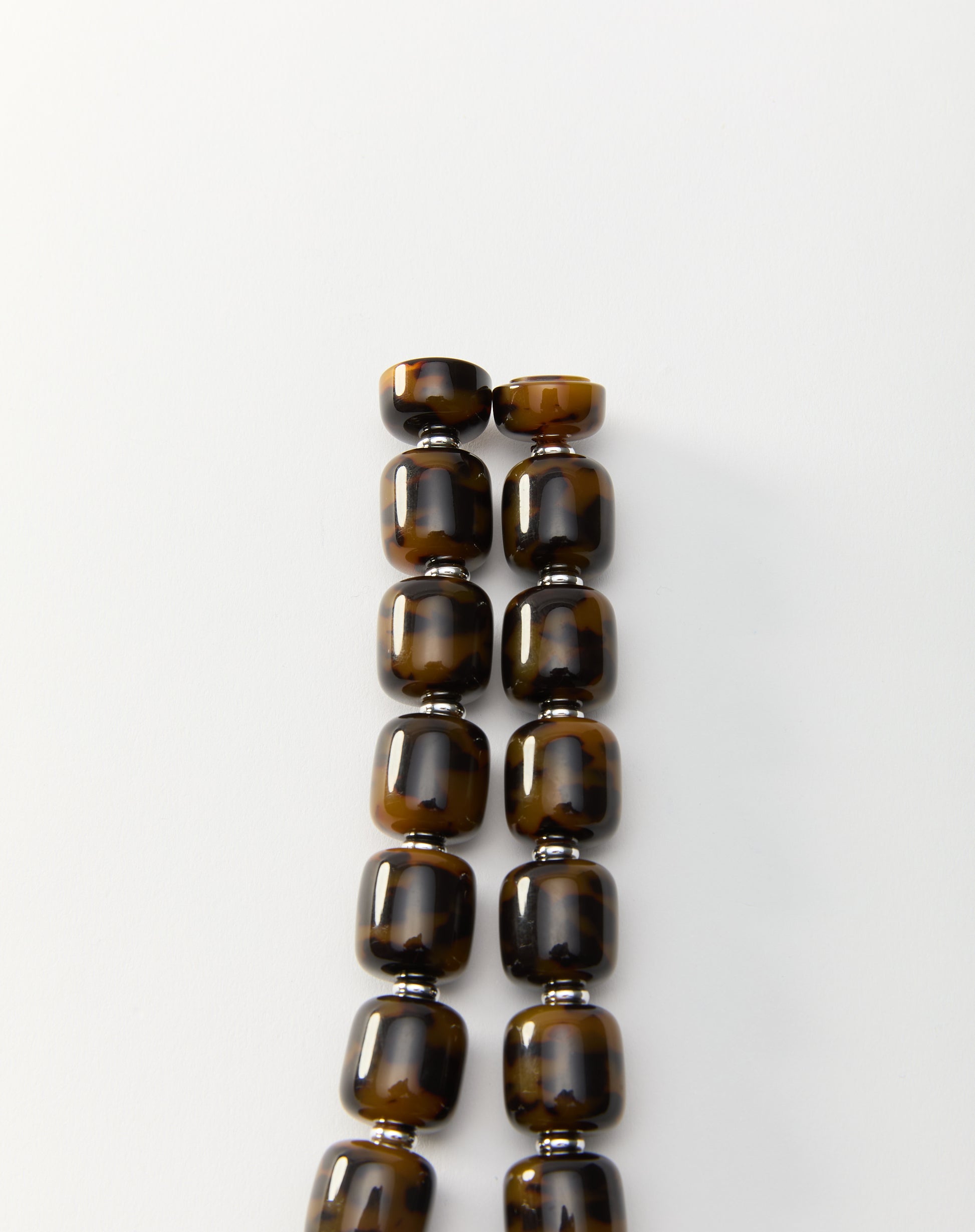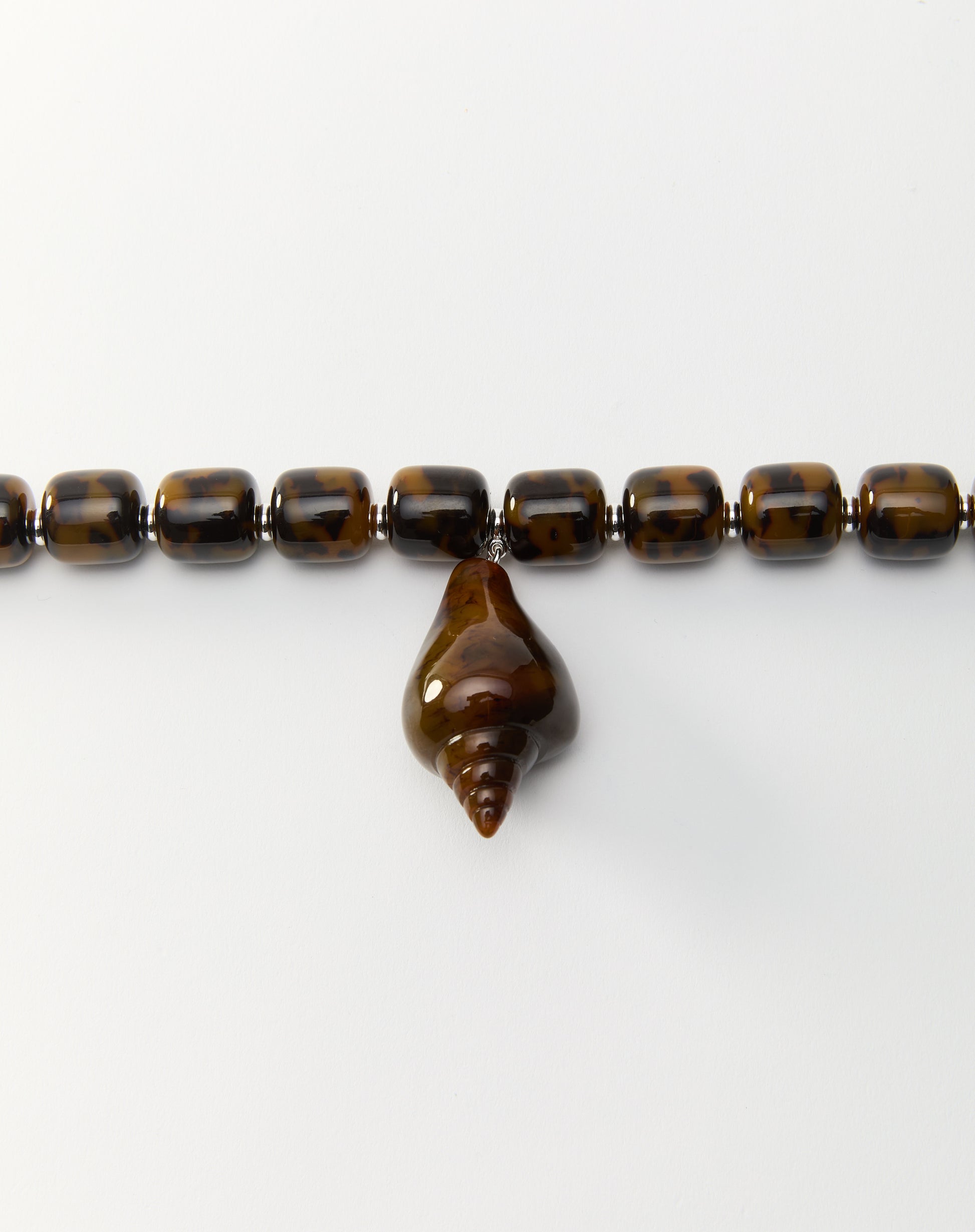 This handmade resin beaded necklace features a sculptural resin shell pendant. Due to its handcrafted nature, each piece is one of a kind and may have slight variations.