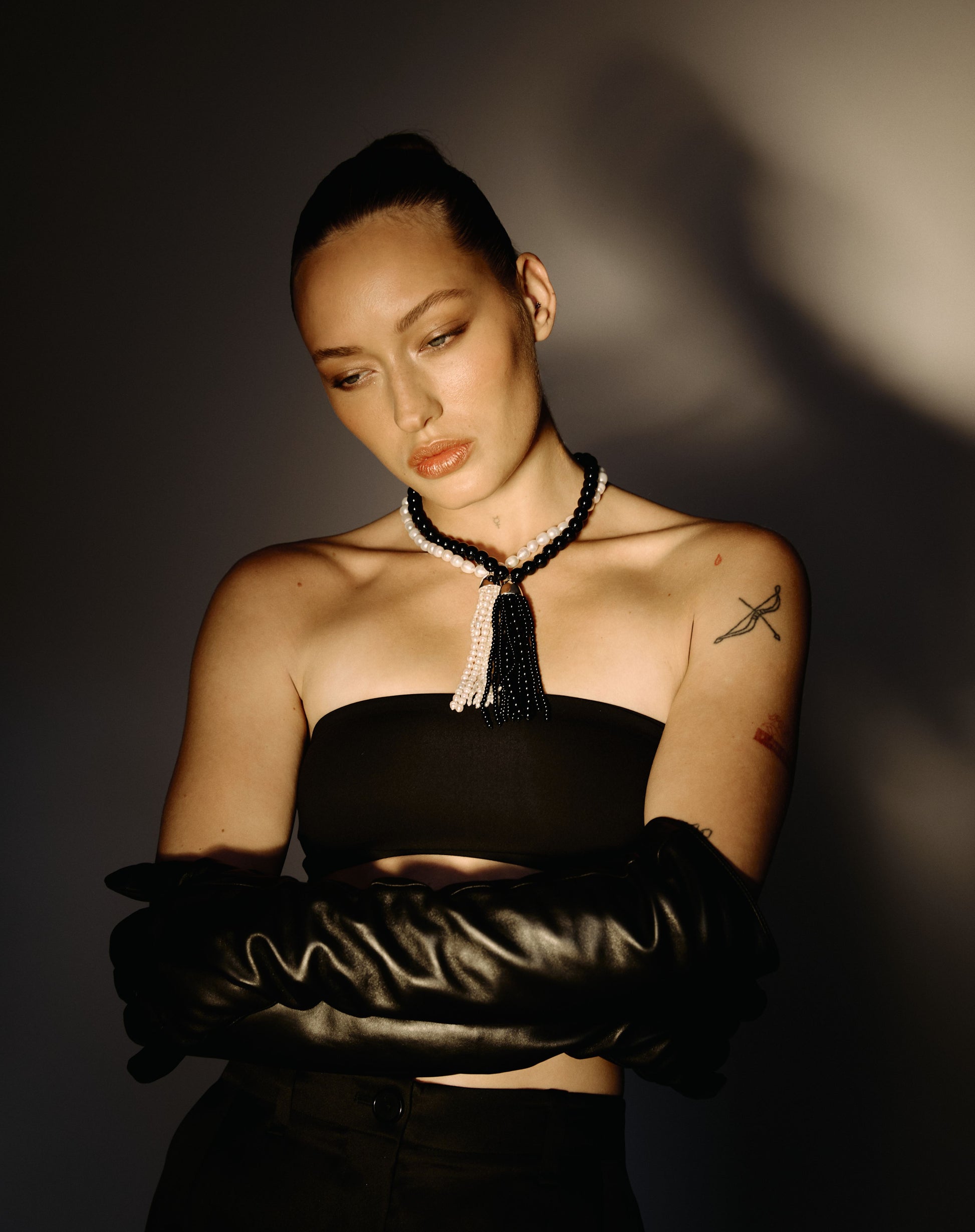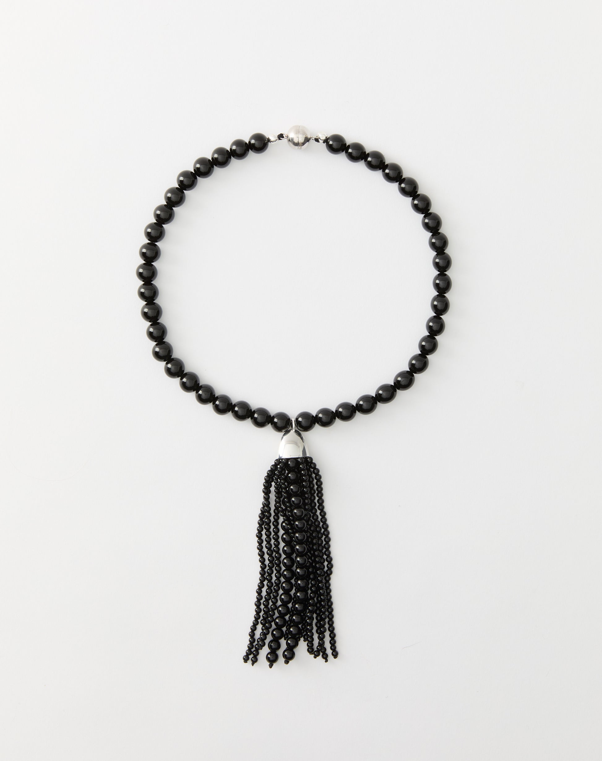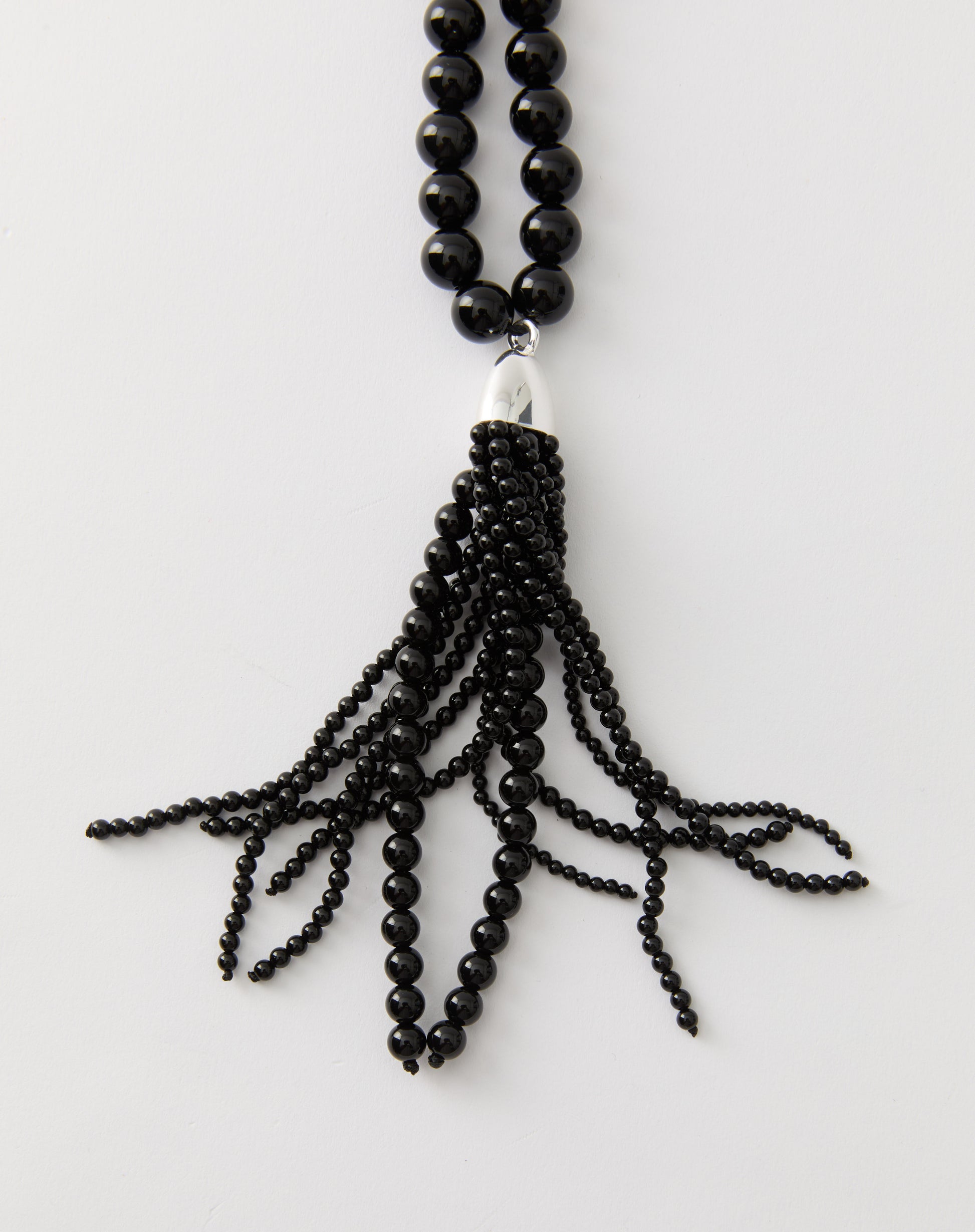Crafted with smooth black onyx beads and rhodium-plated brass, this necklace features a matching tassel for added movement.
