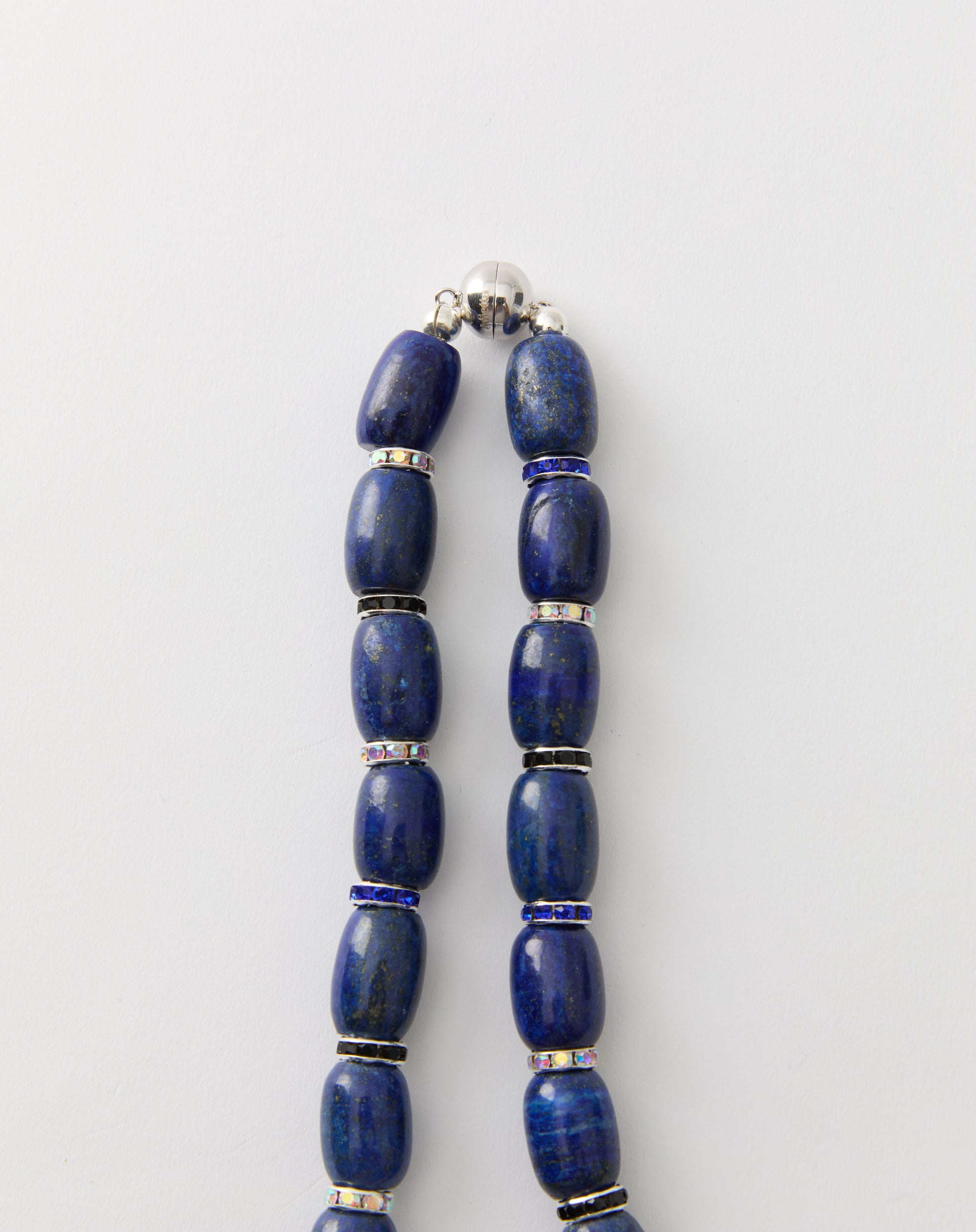 The Donna Necklace is designed with versatility in mind, easily dressed up or down. Composed of lapis lazuli beads and crystals, it carries a timeless sensibility with lasting appeal. Finished with our signature magnetic clasp for ease of wear.