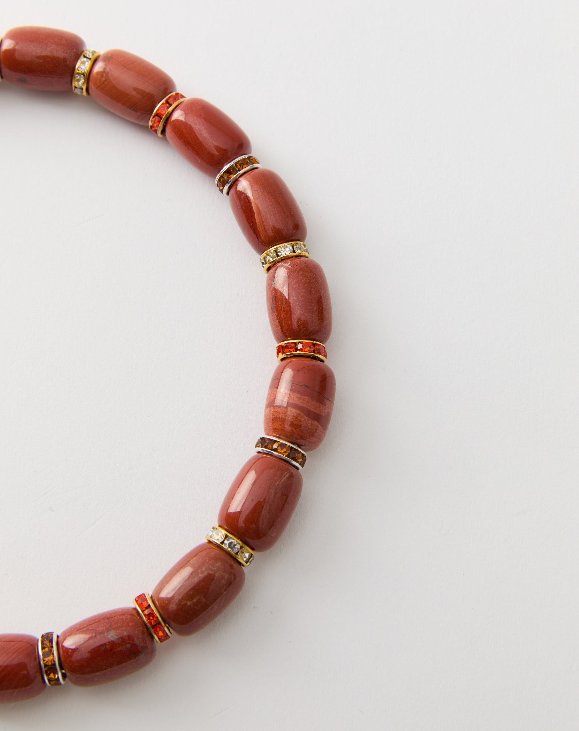The Donna Necklace is designed with versatility in mind, easily dressed up or down. Composed of red jasper beads and multicolored crystals, it carries a timeless sensibility with lasting appeal. Finished with our signature magnetic clasp for ease of wear.