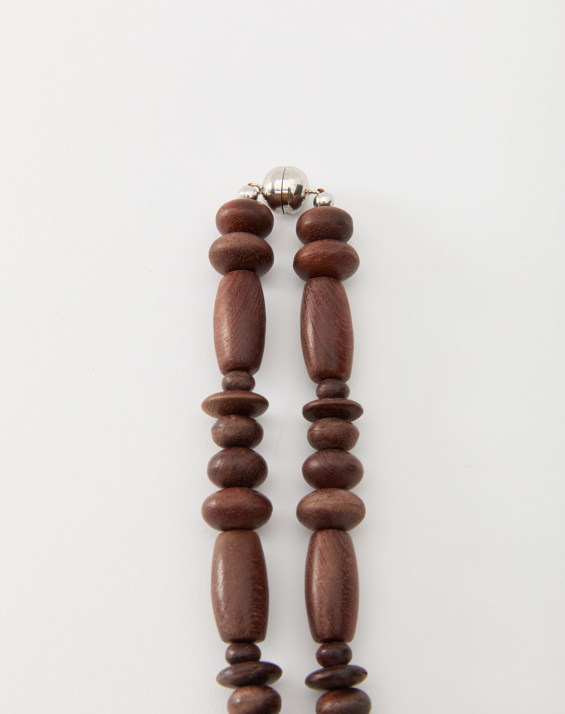 A wooden beaded necklace featuring a rhodium-plated silver medallion pendant with cascading wooden strands. Finished with a magnetic clasp for effortless, versatile wear.