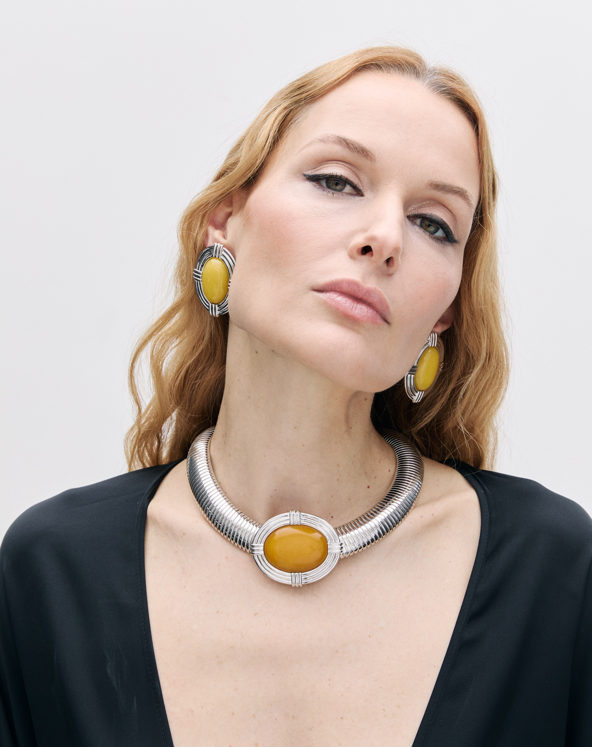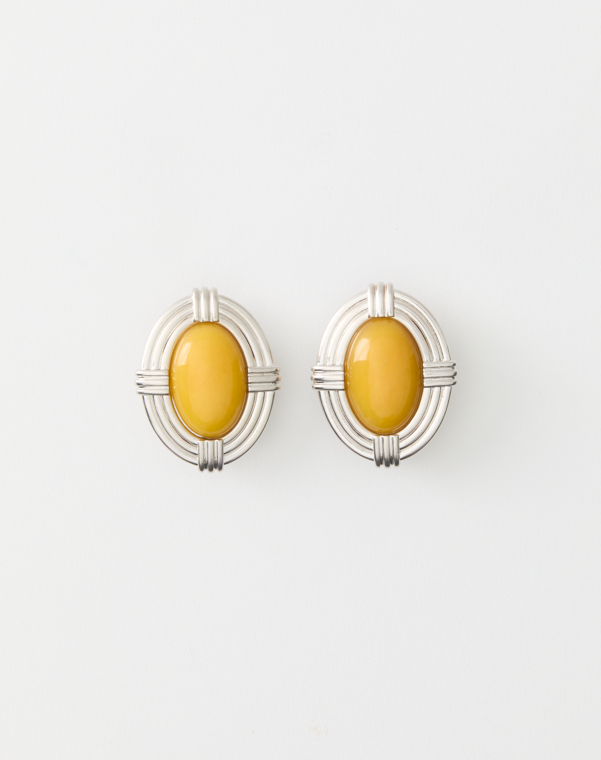 Meet the Hera Earrings. A refined classic, crafted from rhodium-plated brass and set with yellow agate cabochons. Thoughtfully designed with our exclusive anti-droop backs for a secure, comfortable fit.