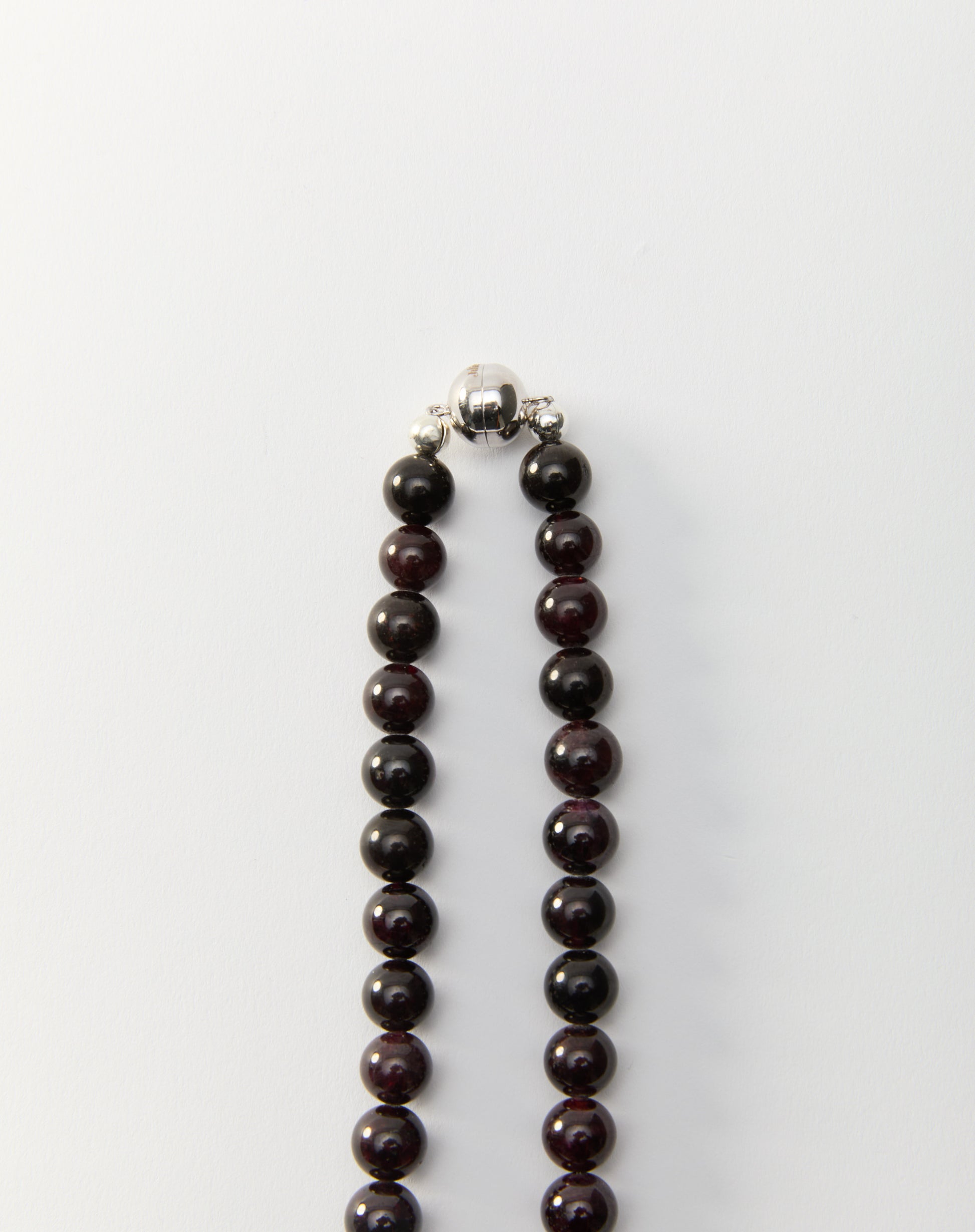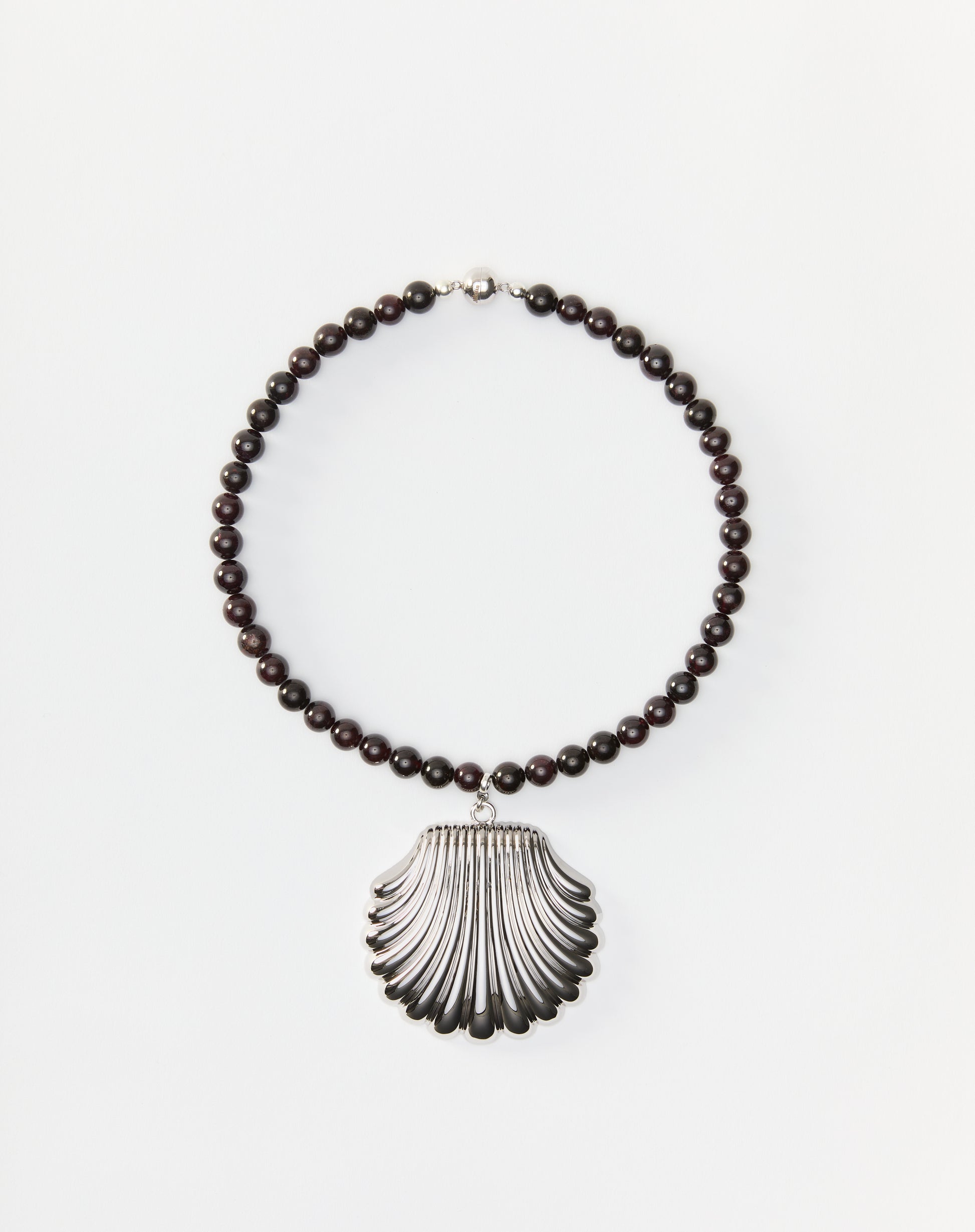 Meet the Holbox necklace. This red garnet beaded design features a large rhodium-plated brass shell pendant and is finished with our signature magnetic clasp for effortless wear. Each piece is one of a kind, with subtle variations that highlight its artisanal nature.