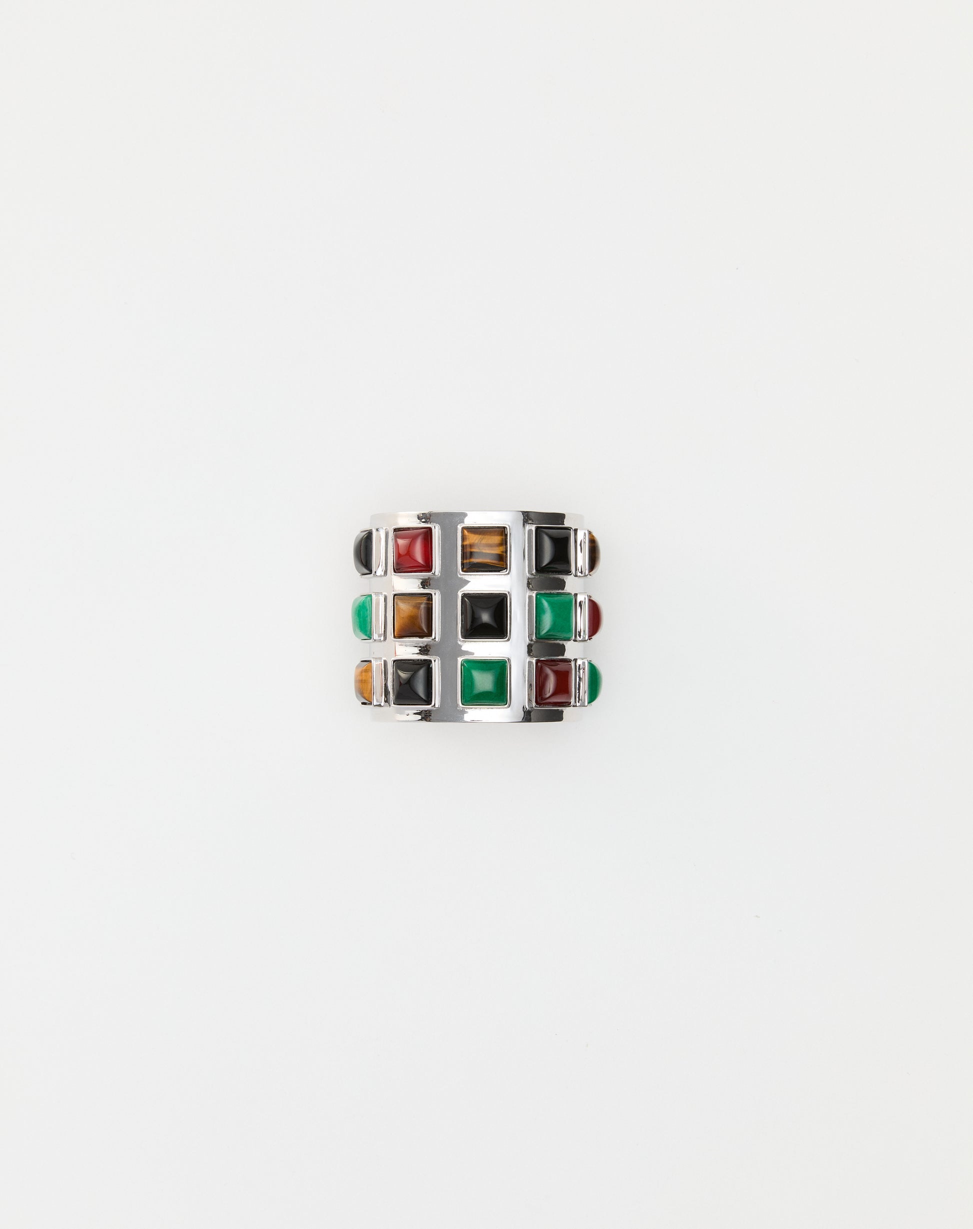 Our Sabine cuff is crafted from rhodium-plated brass and set with a mix of natural stones, including tiger eye, red carnelian, and black onyx. Its sculptural silhouette makes a bold statement while remaining surprisingly lightweight. Designed to turn heads, whether worn on its own or paired with your favorite stack.
